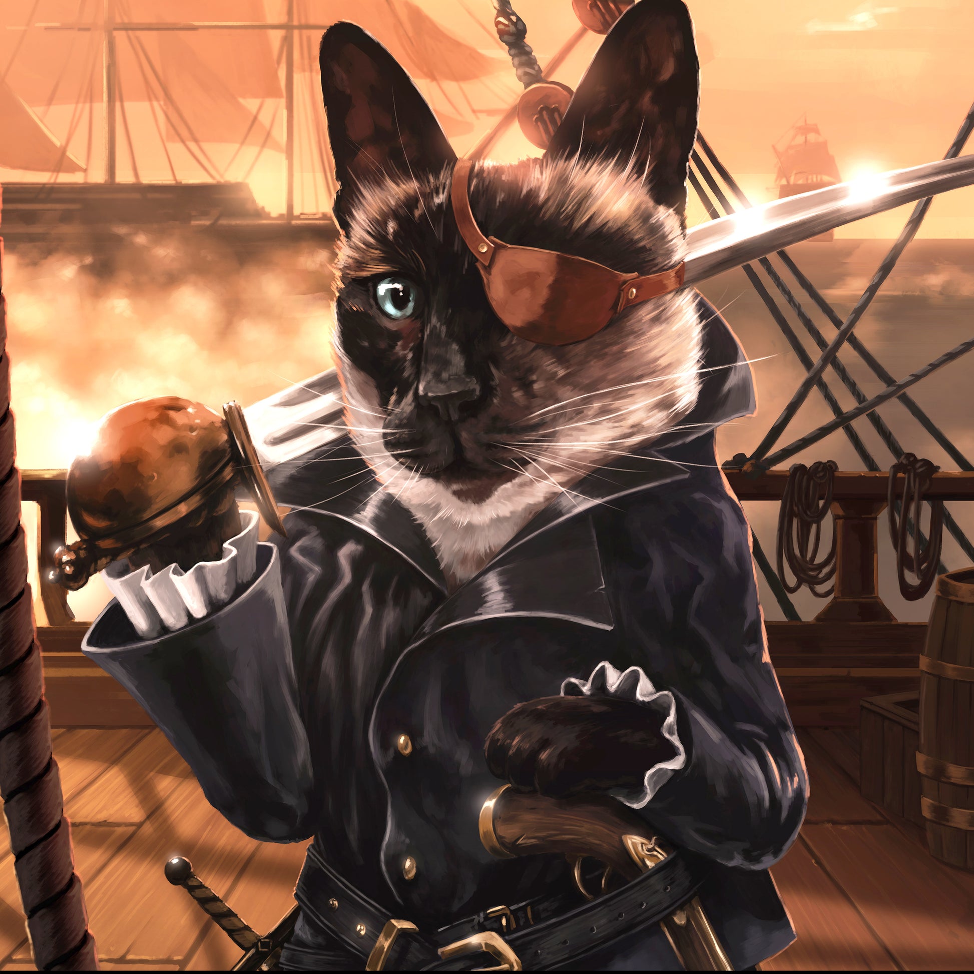 This scene shows a one-eyed Siamese Swashbuckler on the deck of a freshly commandeered seafaring vessel!